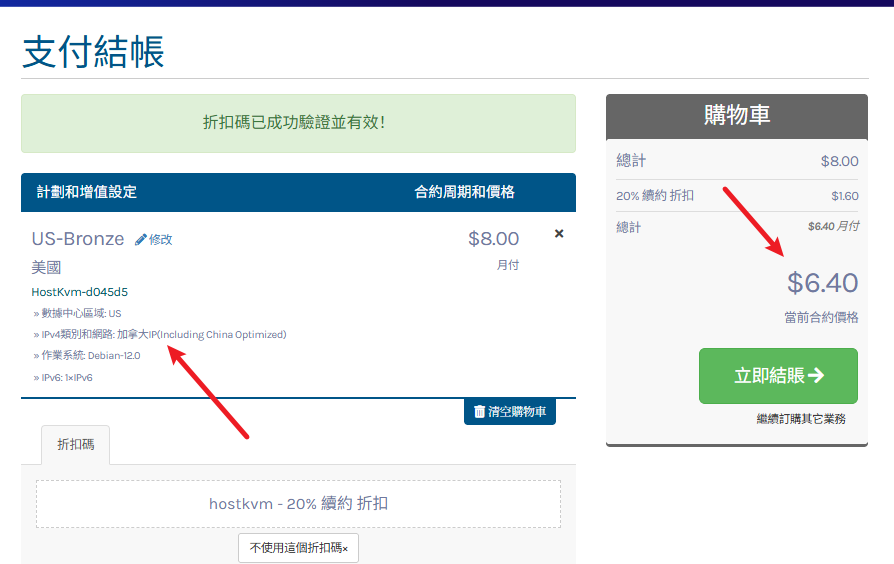 优惠码:hostkvm,8折,循环折扣,全场可用,支付宝或PayPal付款。