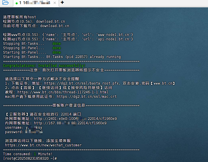安装个BT宝塔面板,1分钟左右完成,还是挺快的。