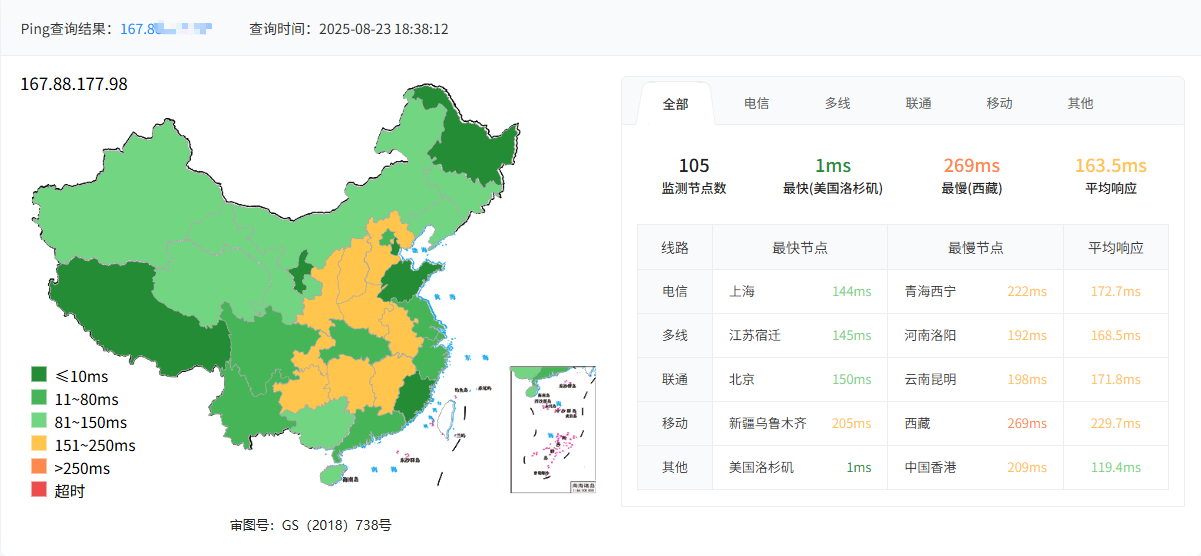 156.00 ms AS4134 [CHINANET-BB] 中国 广东 广州 www.chinatelecom.com.cn 电信